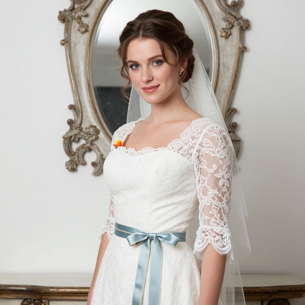 Photograph of a young Caucasian woman with fair skin and dark brown hair in an elegant updo, wearing a white lace wedding dress with three-quarter sleeves, a sweetheart neckline, and a light blue satin ribbon tied in a bow at the waist. She has blue eyes, subtle makeup, and a gentle smile. A small orange flower is pinned to her left shoulder. She wears a sheer white veil. The background features an ornate, oval mirror with a vintage frame mounted on a white wall. The lighting is bright, highlighting her features and the lace texture of her dress.