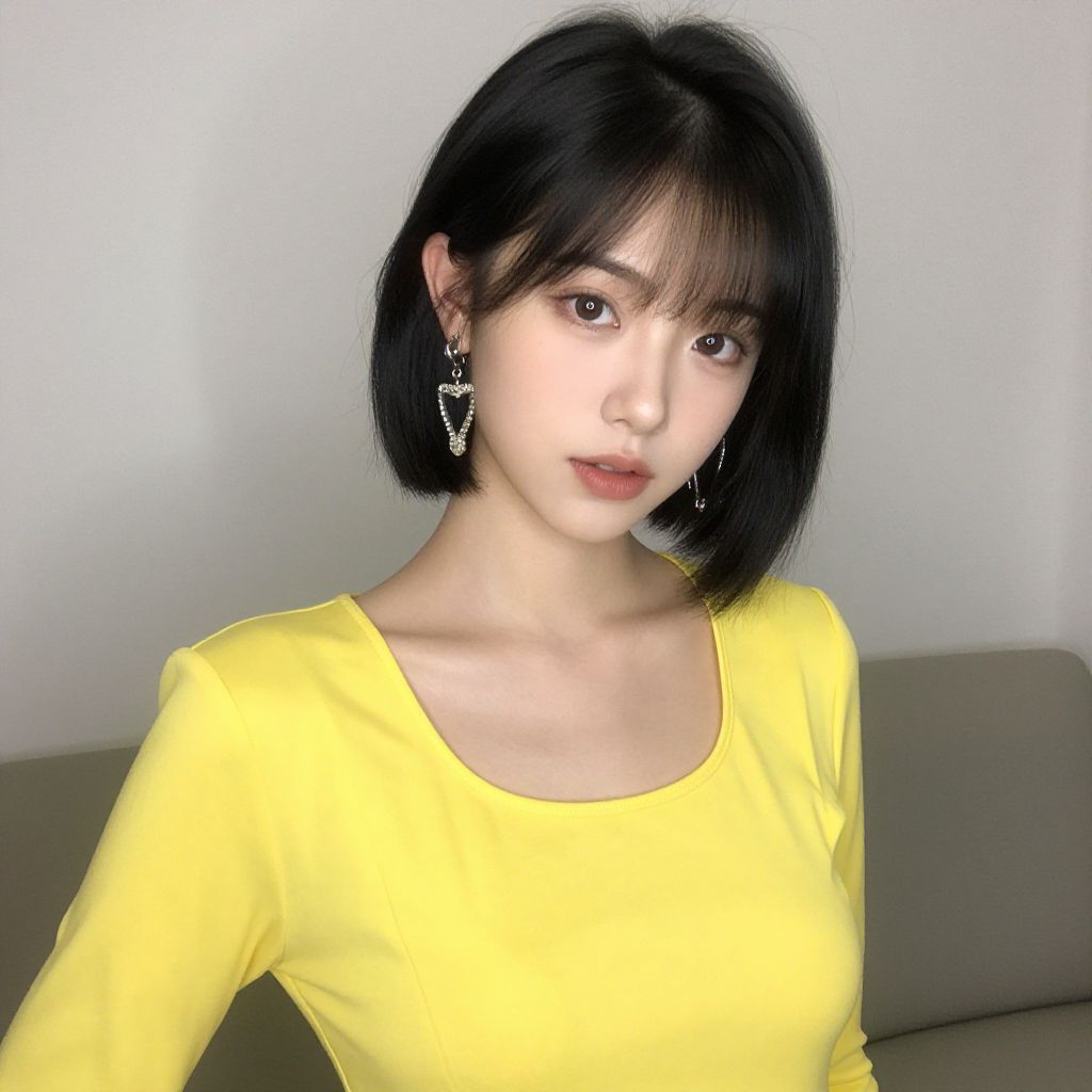 Photorealistic digital portrait of an Asian woman with short black hair, wearing a gray turtleneck, red lipstick, and small earrings.