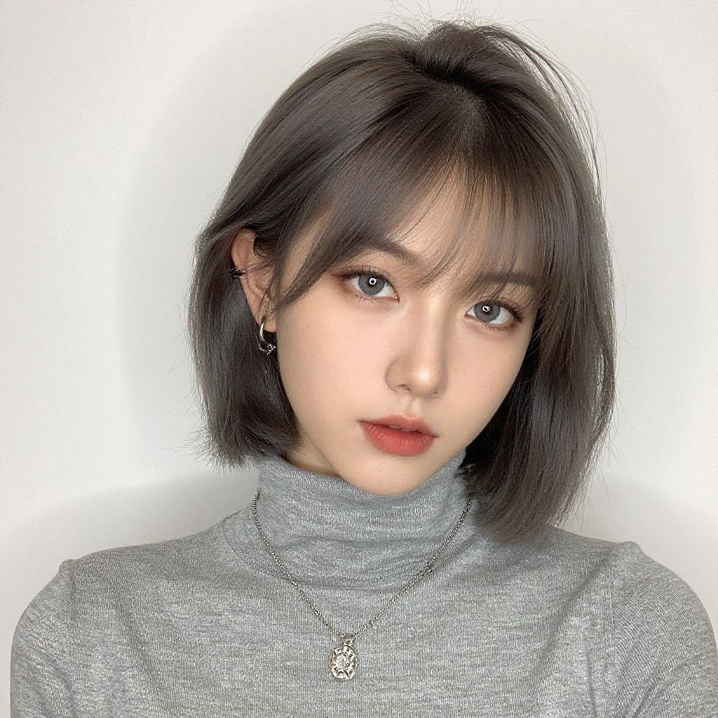 This is a highly realistic digital portrait of an East Asian woman with fair skin and straight, shoulder-length black hair with bangs. She has large, expressive brown eyes, subtle eyeliner, and red lipstick. She wears a gray, textured turtleneck sweater and small, black, dangling earrings. Around her neck is a delicate necklace with a small, intricate pendant. The background is plain white, making her the focal point. The image has a soft, slightly glowing effect, enhancing her delicate features and giving a slightly ethereal quality.