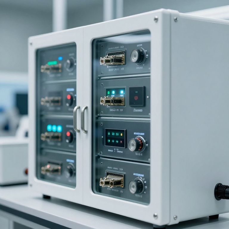 Blur sci-fi hi-tech laboratory equipment modules, white metal and glass, many networking indicators,