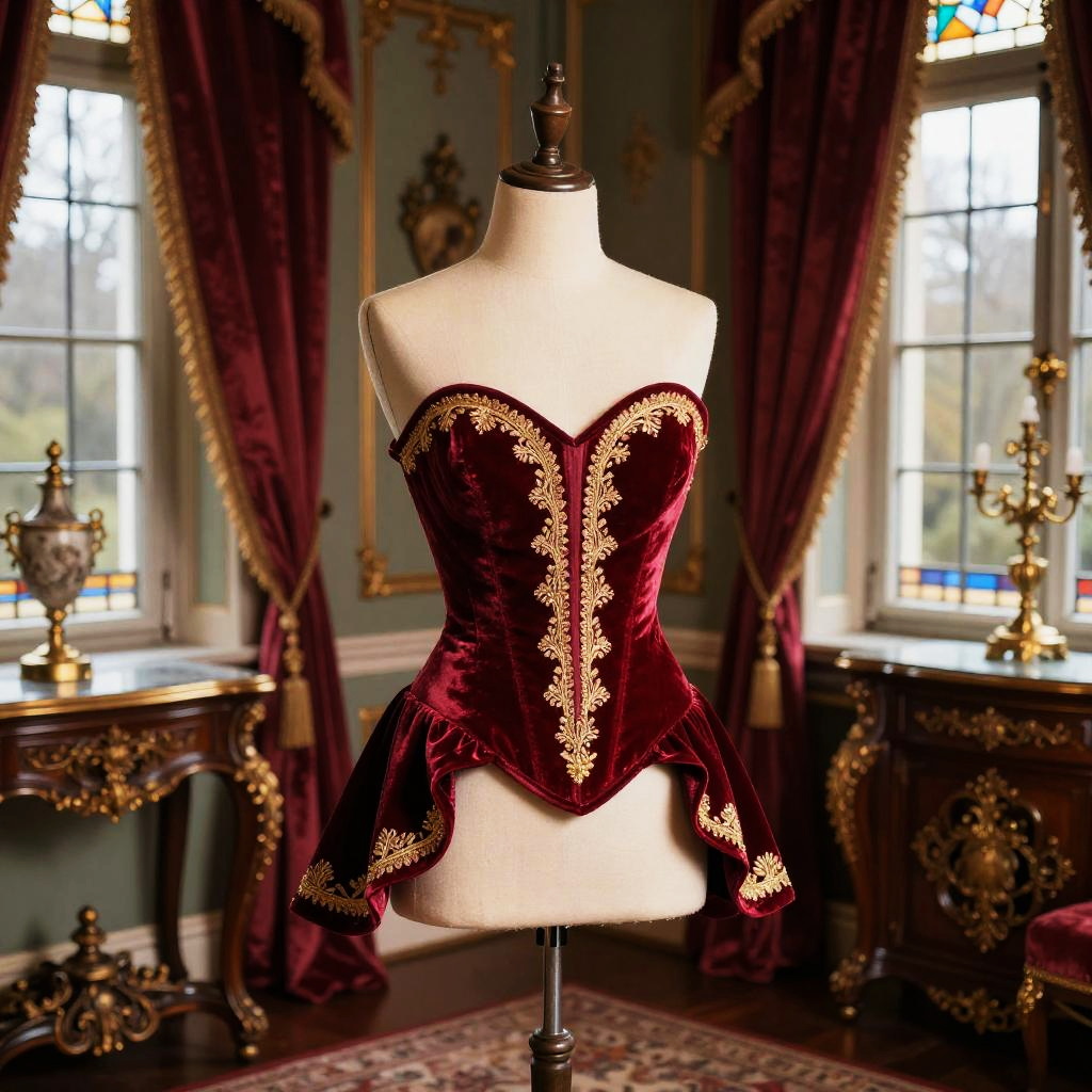 Elegant hobble corset made of deep crimson velvet with gold embroidery, displayed on a mannequin in a lavish Victorian dressing room, rich textures of silk curtains and ornate wooden furniture, soft natural light from stained glass windows