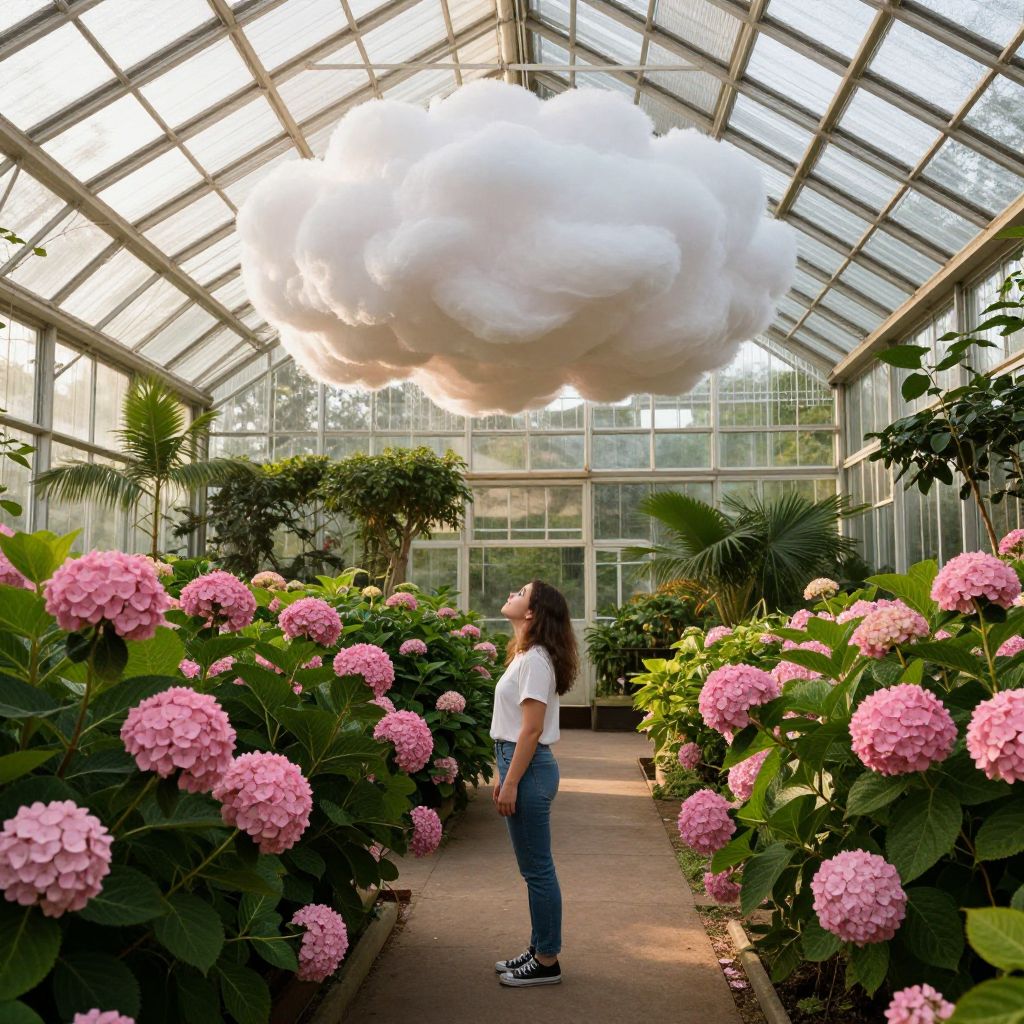 A woman stands in a vibrant greenhouse, surrounded by lush greenery and blooming pink hydrangeas, as she gazes upward at a towering, cotton-candy-like cloud formation rising majestically through the arched glass ceiling, bathed in golden sunlight.