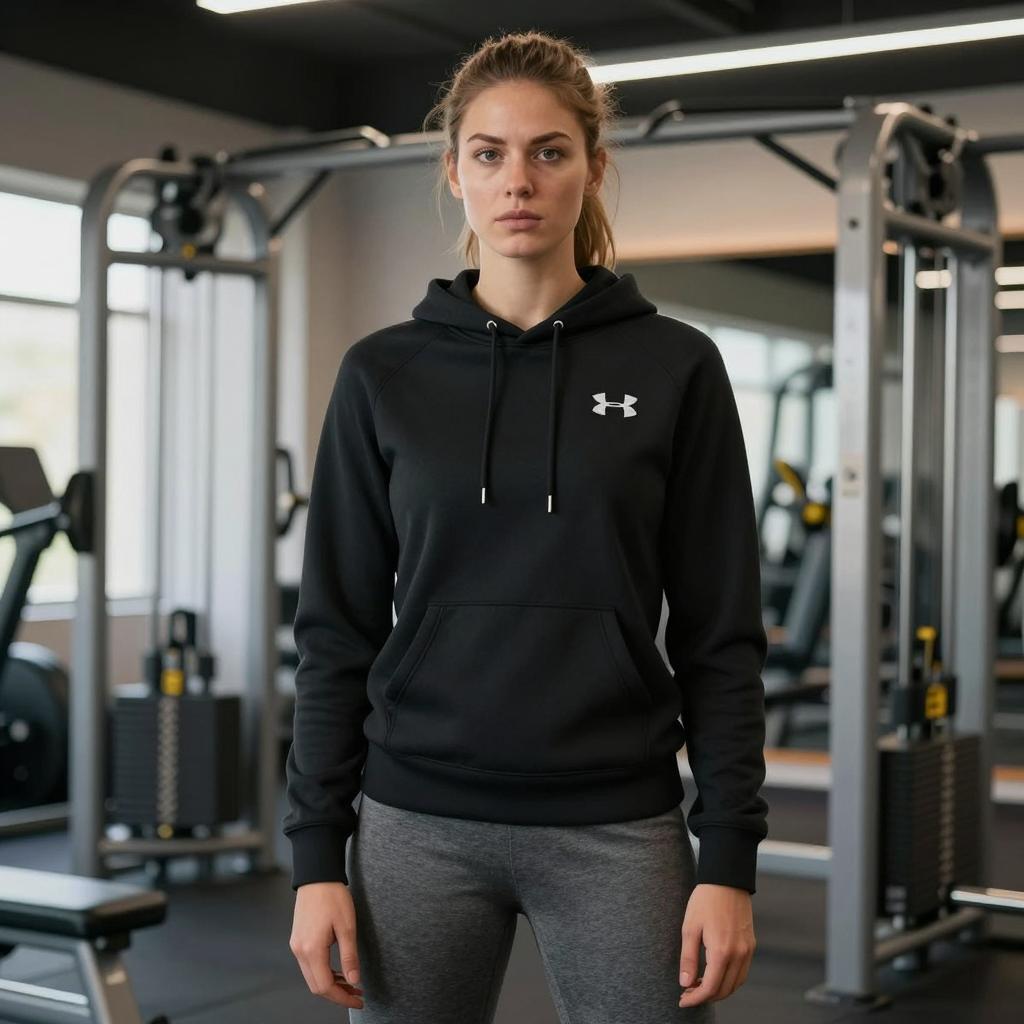 Photograph of a fit young woman with an athletic build wearing a teal Under Armour sports bra and matching high-waisted leggings with a cut-out design on the stomach. She stands against a dark indoor backdrop, wearing black and white sneakers, with natural light coming from the left. Her hair is pulled back, and she has a serious expression, showcasing contemporary fitness apparel.
