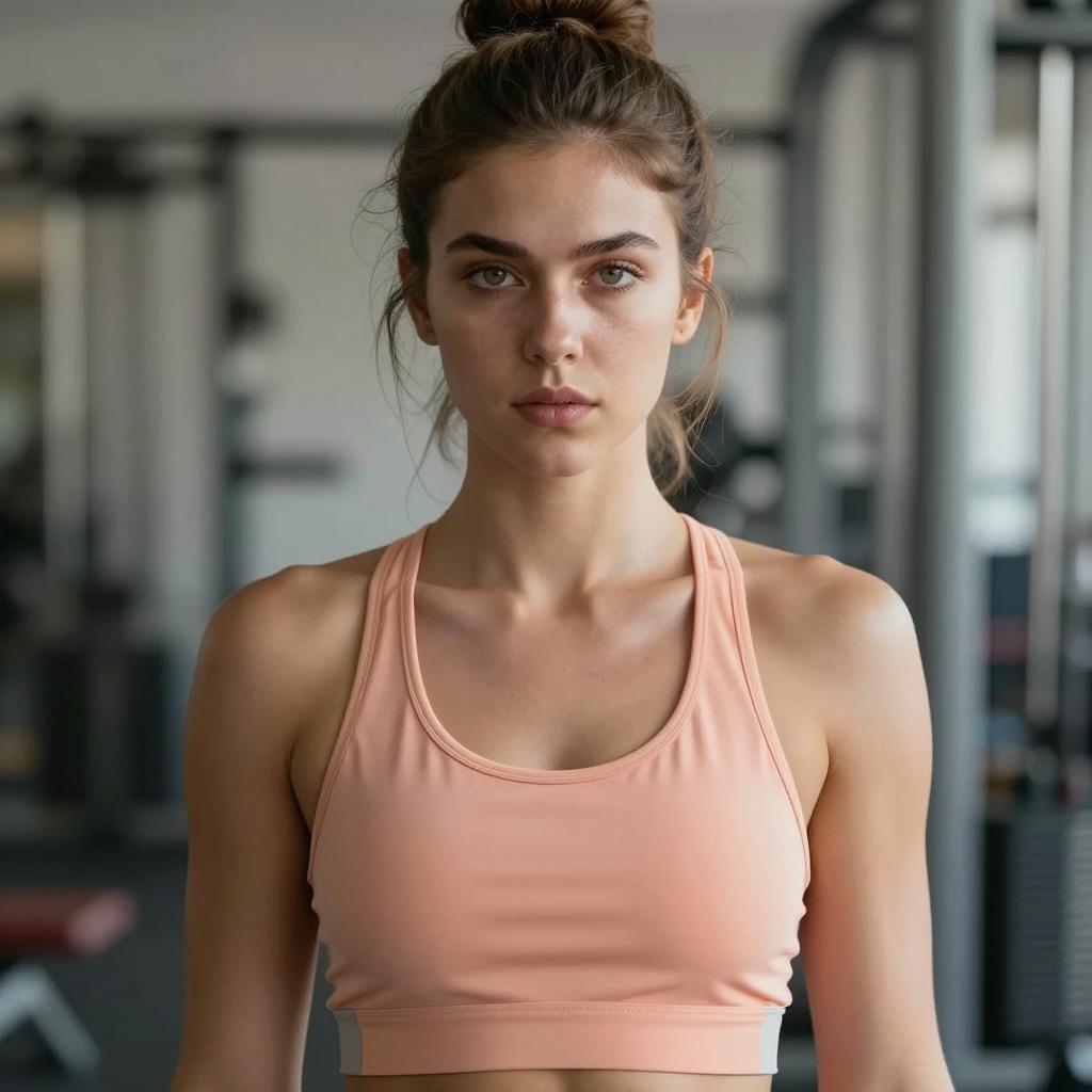 Gymshark leggings costume, photograph of fit young man, athletic build, short brown hair, wearing teal Under Armour sports bra and matching leggings, cut-out design on stomach, black and white sneakers, standing in front of dark, patterned background, natural light from left, serious expression, indoor setting, casual pose, realistic style, detailed ures, contemporary fashion, fitness apparel