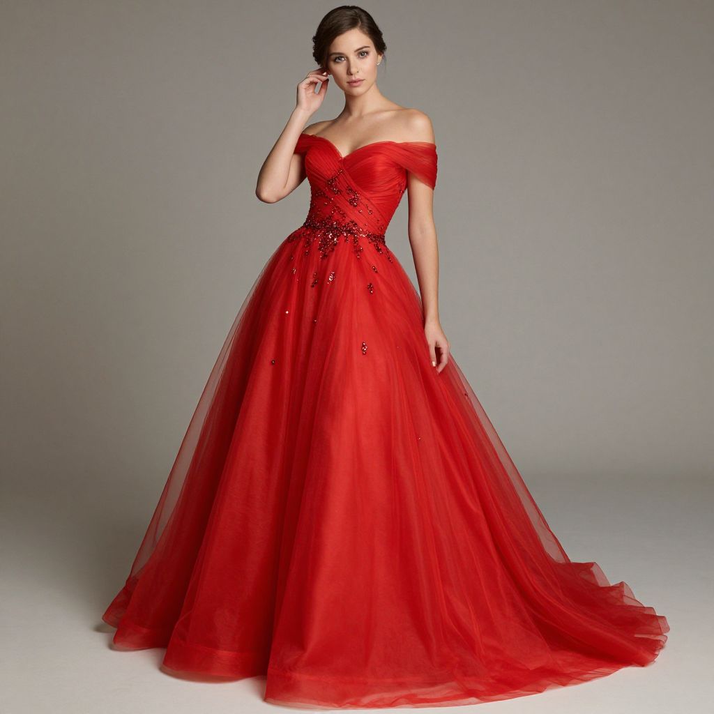 Elegant woman wearing a vibrant red sweetheart off-the-shoulder tulle long prom dress, featuring a sparkling embellished bodice and flowing skirt, poised gracefully against a neutral backdrop.