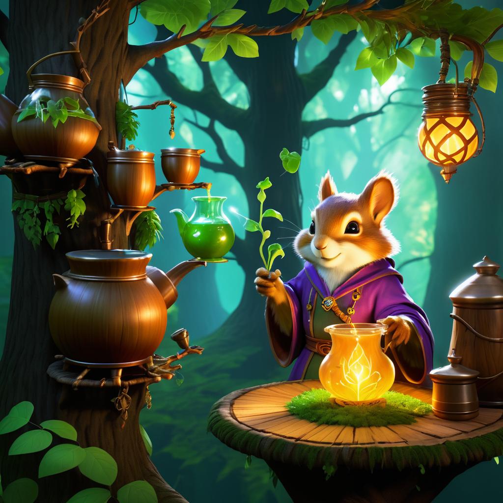 Cinematic style illustration of an anthropomorphic squirrel dressed in a purple robe, brewing a glowing potion in green and yellow glass flasks inside a moss-covered treehouse. The scene features vibrant volumetric lighting and a magical forest background, evoking a fantasy theme reminiscent of Magic: The Gathering artwork.