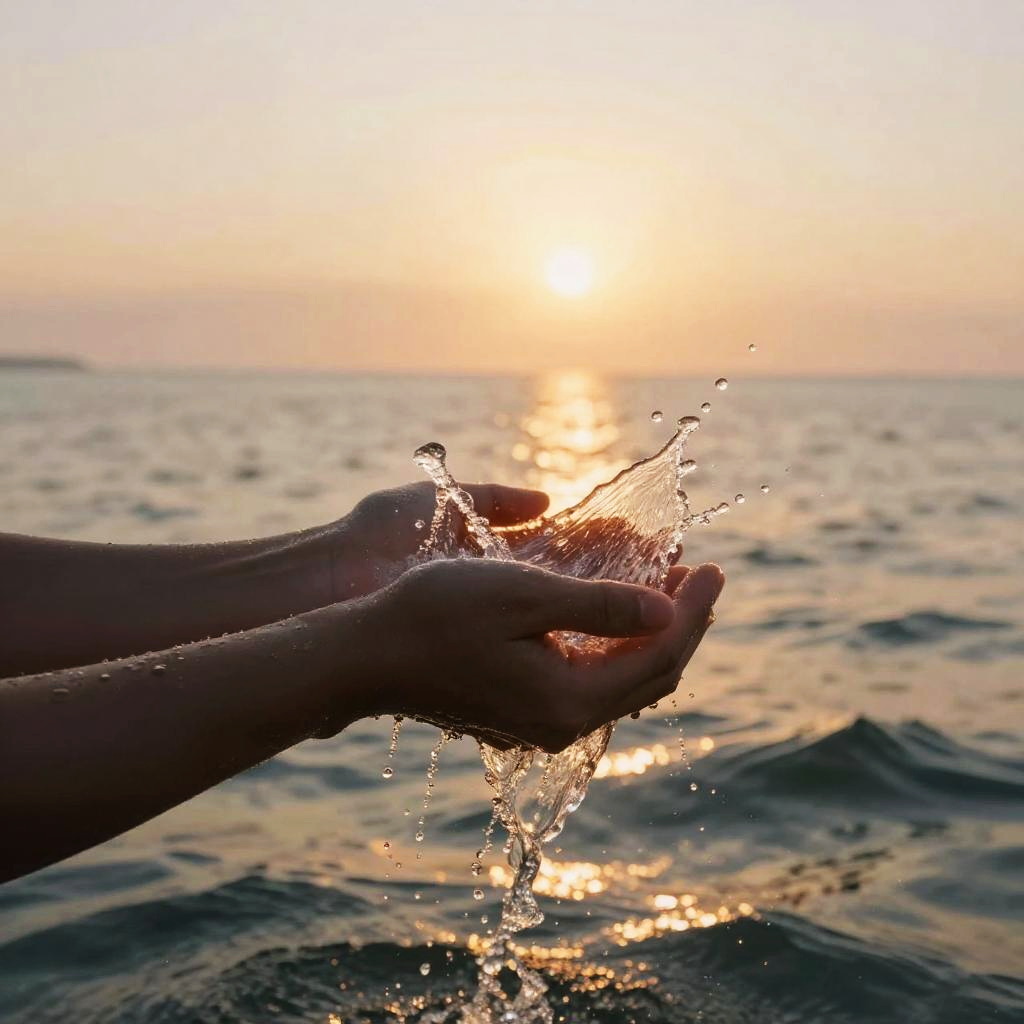 Two hands holding water, creating a splash with shimmering reflections, set against a serene ocean background at sunset, cinematic lighting, ultra detailed