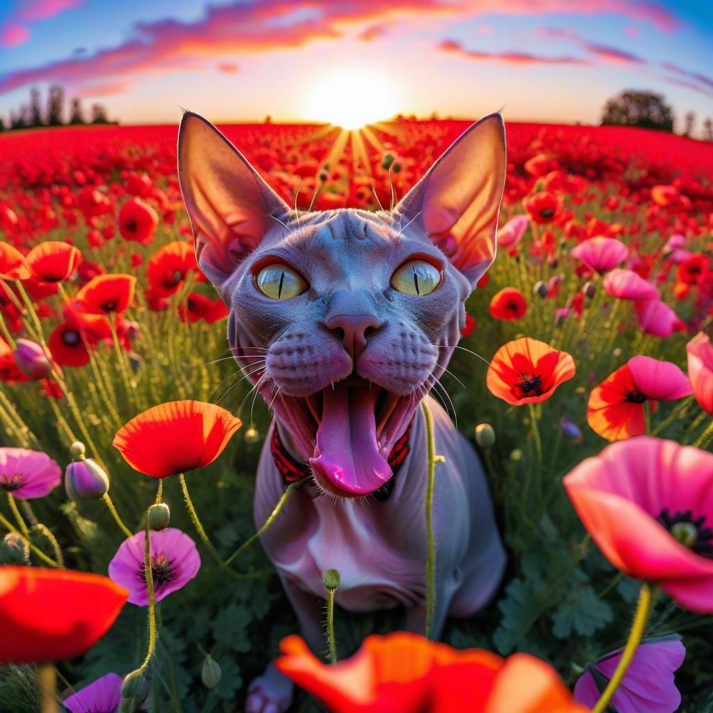 A close-up of a playful meowing sphynx cat sticking out its tongue in a vibrant field of poppies under a bright purple sky, natural sunlight illuminating the scene, fisheye lens effect with 180-degree distortion, sharp focus on the animal's face and flowers, cheerful and lively atmosphere
