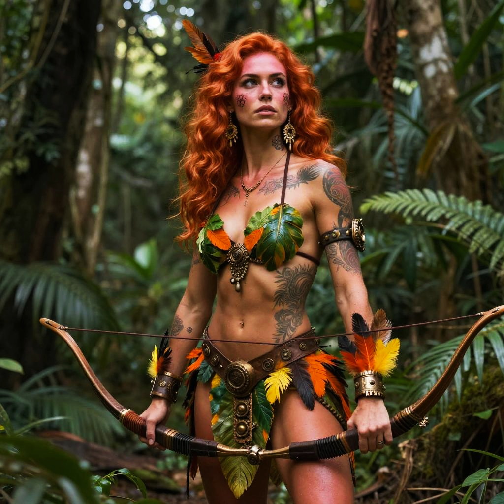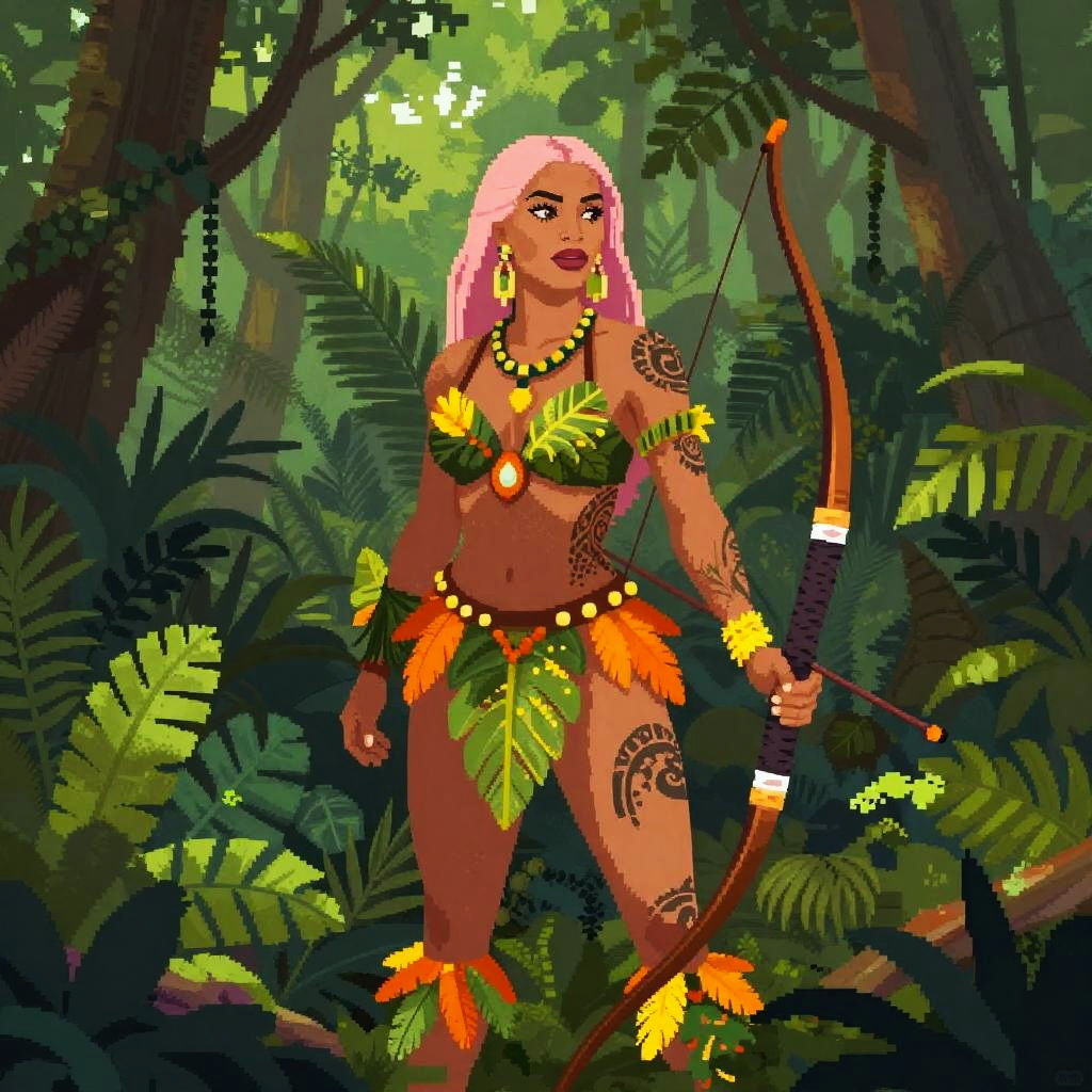 A strong athletic woman with ivory skin and pastel pink hair standing in a dense tropical rainforest, wearing tribal-inspired clothing made of leaves and feathers in vibrant orange, green, and yellow colors, intricate body tattoos, holding a bow, surrounded by lush green foliage and filtered sunlight, pixel art style, detailed shading, warm earthy tones