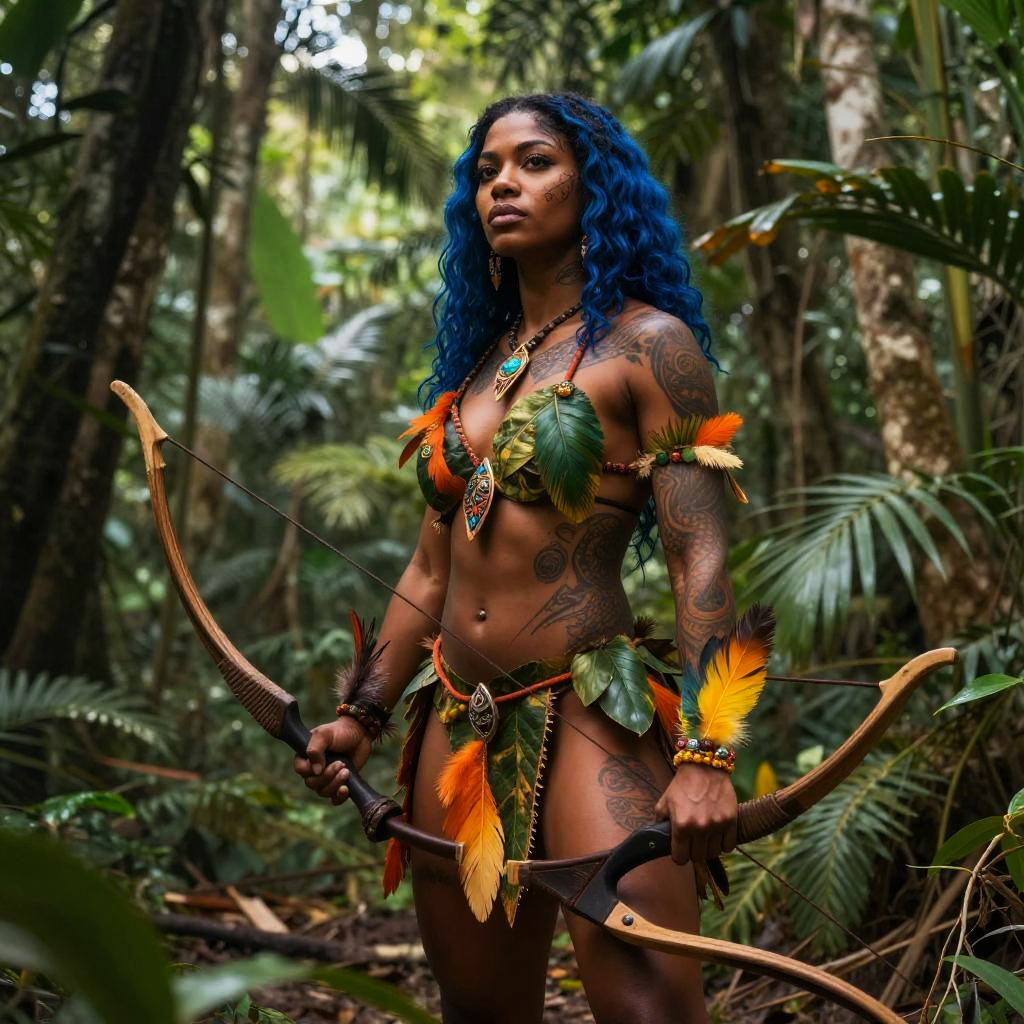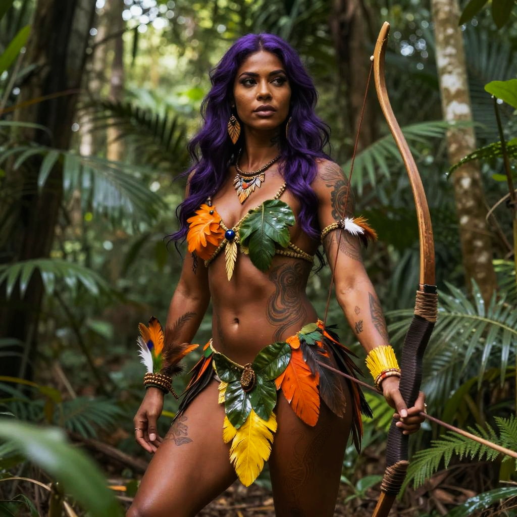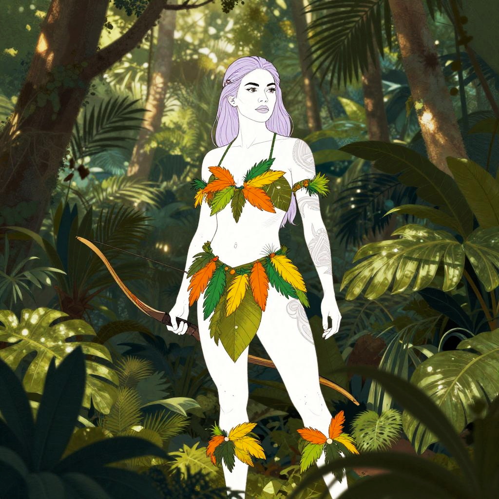 Digital artwork of a pink-haired, tan-skinned warrior woman with tribal tattoos, wearing a leaf bikini and bow, standing in a lush jungle. She