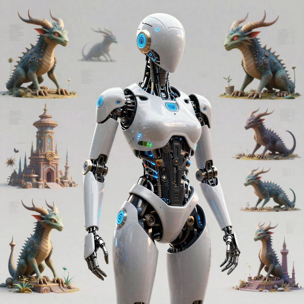 Concept art AI shown as a sleek android merging with digital environments, generating imaginative concept designs of fantastical creatures and architecture, dynamic composition with vibrant colors and sharp contrasts in a cyber-fantasy setting