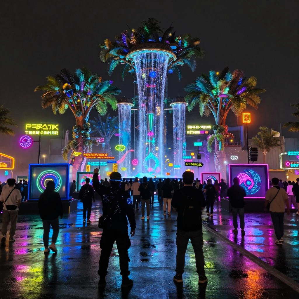 Photograph of a neon-lit, nighttime urban scene featuring a large, illuminated water feature with cascading lights at its center. Surrounding the water feature are neon signs in vibrant colors, including blue, pink, green, and yellow, advertising various businesses. Palm trees with colorful lights are placed symmetrically in the background. The ground is wet, reflecting the neon lights, and is populated with silhouetted people standing and walking, some taking photos. The overall atmosphere is vibrant and bustling, with a futuristic, festive feel. The sky is dark, highlighting the neon glow.