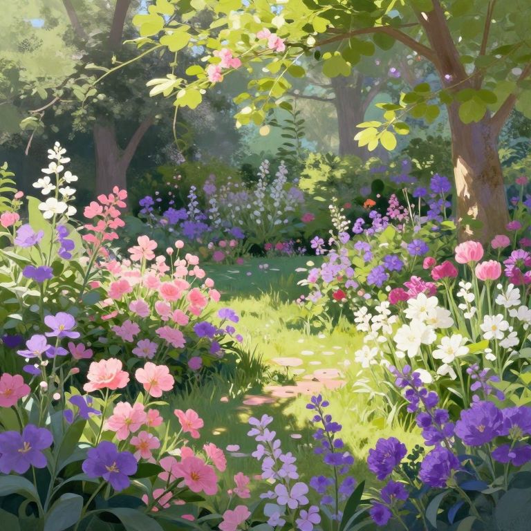A mesmerizing digital artwork captures a tranquil garden scene from an elevated viewpoint, showcasing the intricate details of blooming flowers and verdant foliage. The vivid colors of the blossoms, including soft pinks, rich purples, and luminous whites, create a harmonious balance with the natural light filtering through the leafy canopy above, casting gentle shadows across the serene landscape below. This enchanting scene evokes a sense of wonder and peace as it blends elements of dreamlike fantasy with meticulous attention to detail reminiscent of Greg Rutkowski's hyper-realistic style.