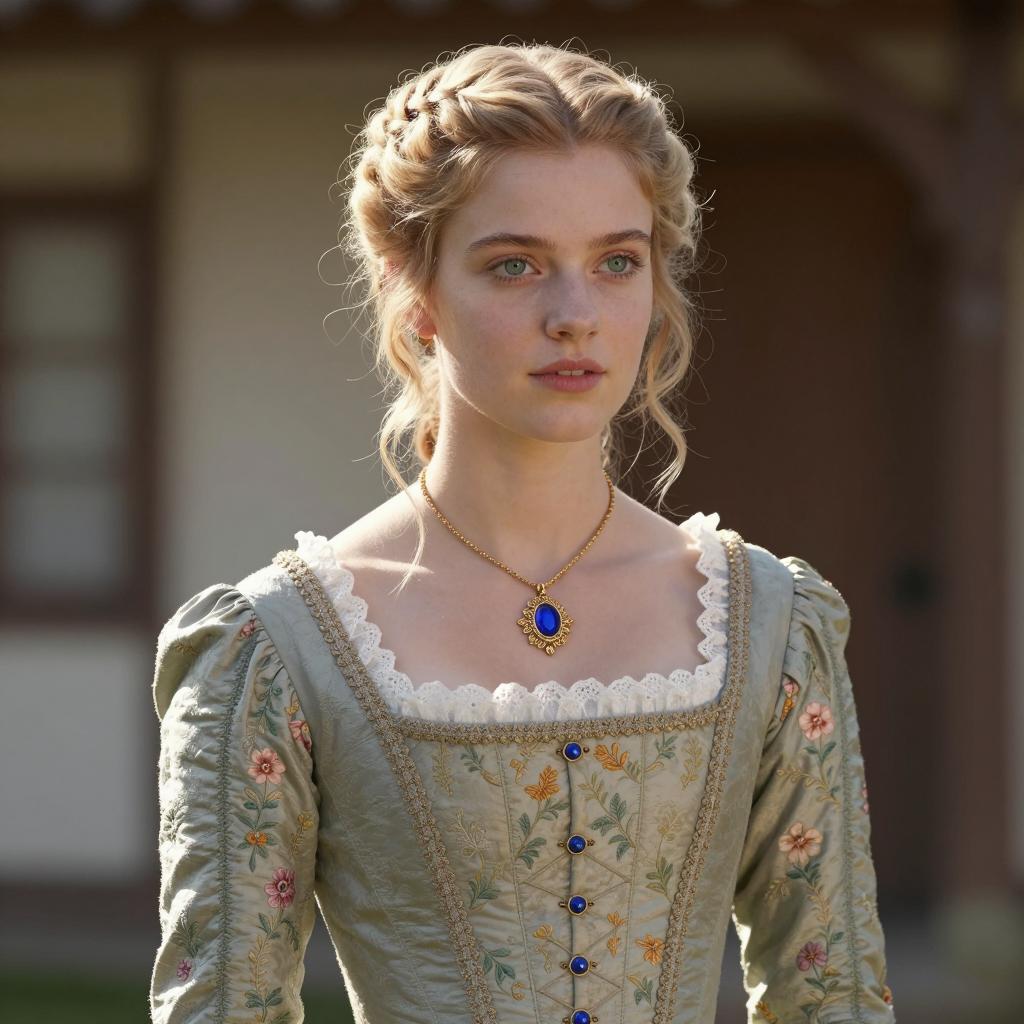 Movie georgie costume, photorealistic portrait of a young blonde woman with wavy shoulder-length hair, wearing a yellow flower crown, dressed in a vintage-style yellow blouse with subtle embroidery, soft natural light, blurred stone wall background, gentle expression, slightly parted lips, blue eyes, fair skin, daytime, realistic ures, shallow depth of field, romantic and nostalgic vibe, subtle makeup, ethereal and calm atmosphere