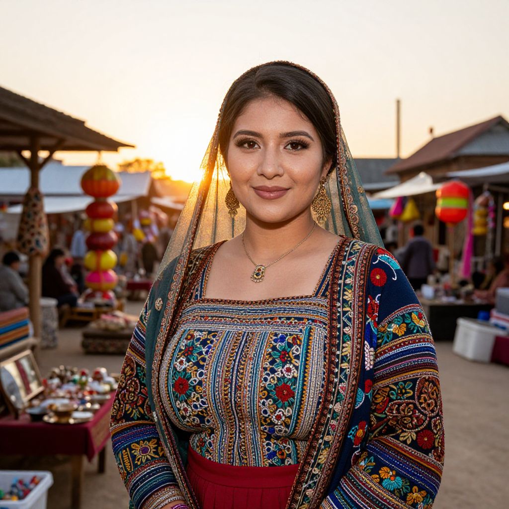 A beautiful woman of ethnic origin wearing traditional wedding attire with intricate embroidery and colorful fabrics, standing in a vibrant village marketplace under a golden sunset, her face adorned with natural makeup and a warm smile, surrounded by local decorations and cultural artifacts.. The woman has big tits and cute face