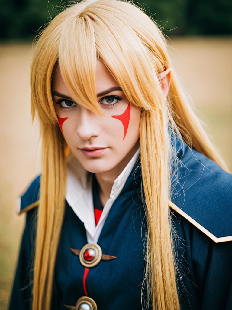Photo-realistic cosplay photo of person in afuro terumi costume. 1boy, red eyes, blonde hair, long hair, very long hairlifestyle stock photo, shallow depth of field, lifestyle stock photography, shallow depth of field, natural lighting, warm tones, soft background blur, candid moments, vibrant colors, realistic textures, modern casual clothing. full body shot