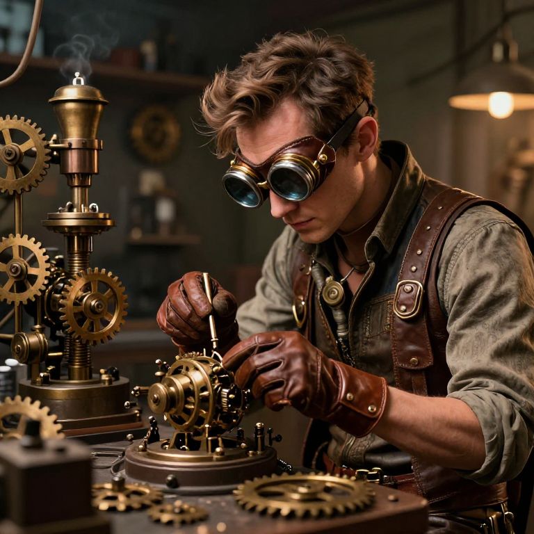A photograph of a young Caucasian man with short, tousled brown hair, wearing large, round goggles and brown leather gloves, meticulously assembling intricate brass gears and machinery in a dimly lit workshop. He wears a brown leather vest over a grey, button-up shirt with rolled-up sleeves. The background features blurred shelves with various mechanical parts and warm, ambient lighting. The image has a steampunk aesthetic, with rich, dark tones and detailed textures highlighting the mechanical components. Smoke subtly rises from one of the gears, adding a touch of industrial atmosphere.