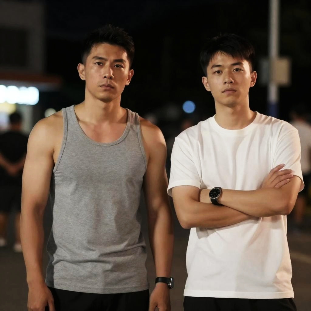 Three shirtless men with wet hair lean on the pool edge, facing forward. The left man has a serious expression, the middle man squints, and the right man wears dark sunglasses. Two cans and a lighter sit on the pool edge in the foreground. The pool water is bright blue. Other partially visible people are in the background.