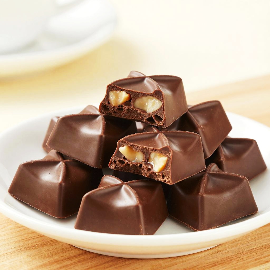 Photograph of stacked, dark chocolate pieces with visible nut centers, on a white plate, against a wooden background.