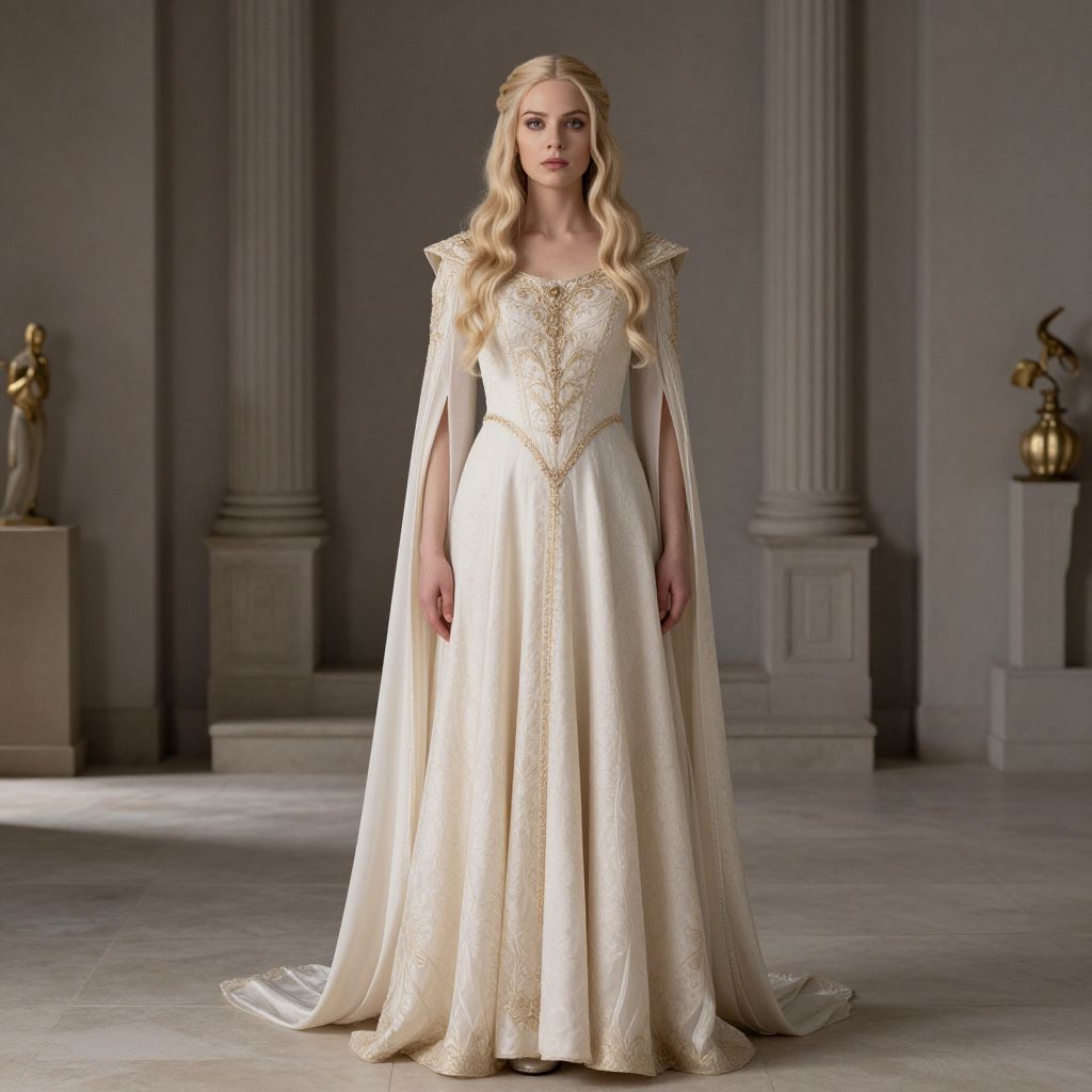 Lotr galadriel dress, a woman in a dress with long blonde hair standing in a room