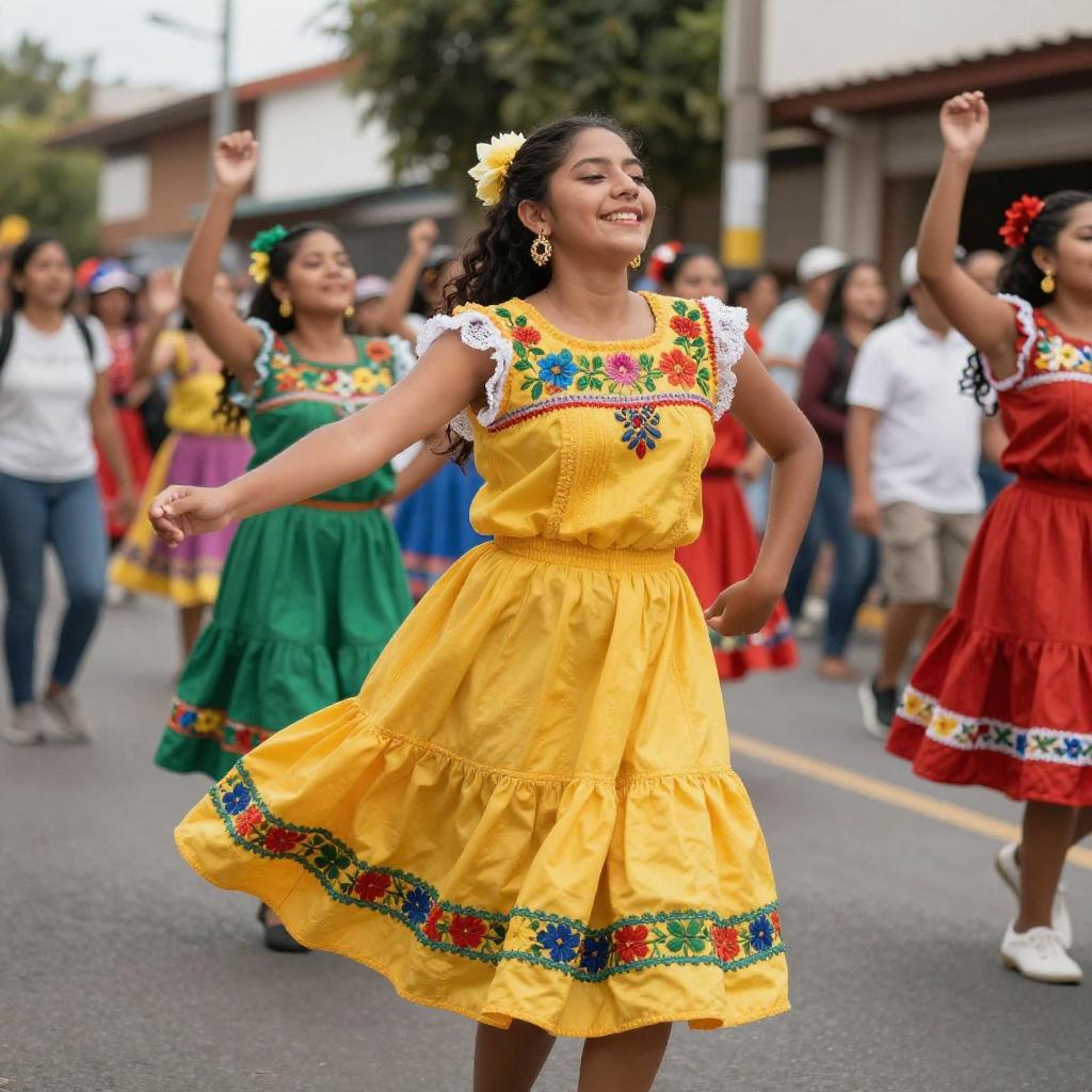 Latina sister dancing energetically in a festive street parade, bright traditional outfit with embroidered patterns, lively crowd celebrating, dynamic and colorful scene