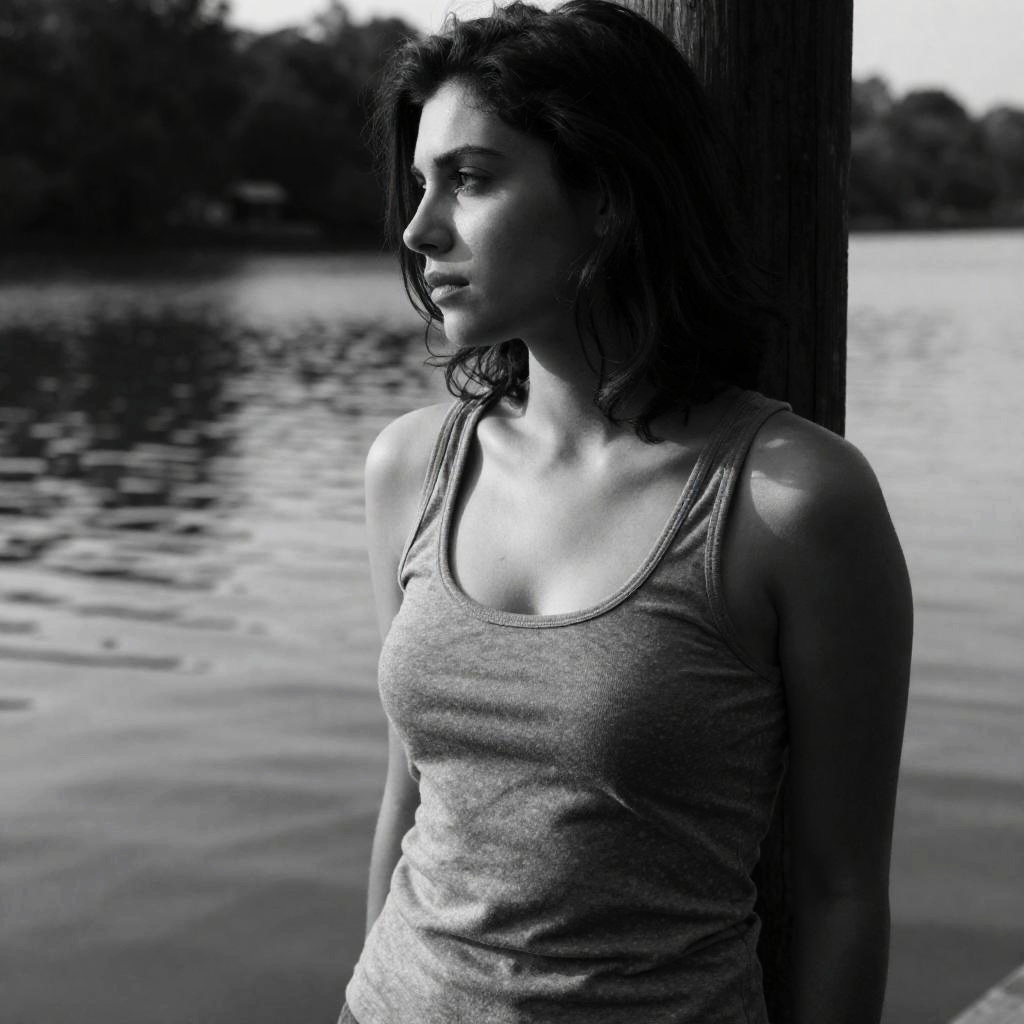 Woman wearing a tank top, near a lake, standing by wooden pole, Style by Greg Manchess, Nicolas de Crecy, Brent Heighton, trending on Artstation, (b&w, Monochromatic, Film Photography:1.3), Photorealistic, Hyperrealistic, Hyperdetailed, film noir, analog style, hip cocked, demure, low cut, soft lighting, subsurface scattering, realistic, heavy shadow, masterpiece, best quality, ultra realistic, 8k, golden ratio, Intricate, High Detail, film photography, soft focus
