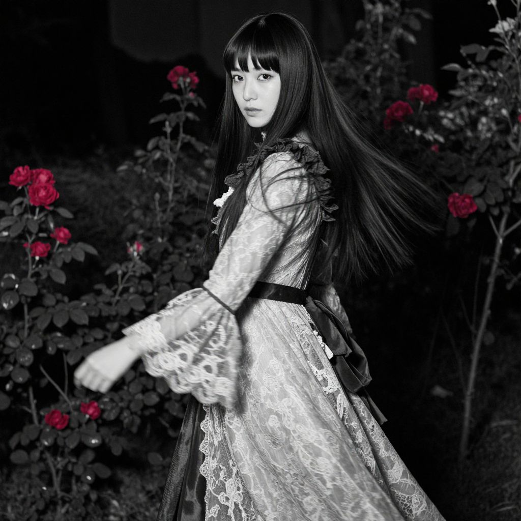 Monochrome, vintage aesthetic, high-fashion editorial motion portrait, A young Japanese woman with long, straight hime cut hair turns to look back at the camera, capturing a fleeting moment of motion in a stunning high-fashion pose, She wears a Victorian-inspired lace gown infused with modern, refined, and avant-garde elements, exuding a gothic sophistication with a hint of utilitarian edge, Her expression holds an unsettling beauty, timeless yet enigmatic, The composition uses a shallow depth of field to blur the foreground and background, focusing on her as she moves, with a touch of motion blur to emphasize her graceful turn, Soft, directional lighting highlights her features and gown, creating a dynamic and elegant aura against the lush, dark foliage and deep reds of surrounding roses, Captured on a Canon EOS R5 with Fujifilm Pro 400H and Ilford HP5 Plus 400-inspired tones, the scene achieves a nostalgic film look with high contrast and cinematic sharpness, The image is a sophisticated blend of gothic romance and contemporary elegance, her eyes meeting the camera with a bold, haunting gaze