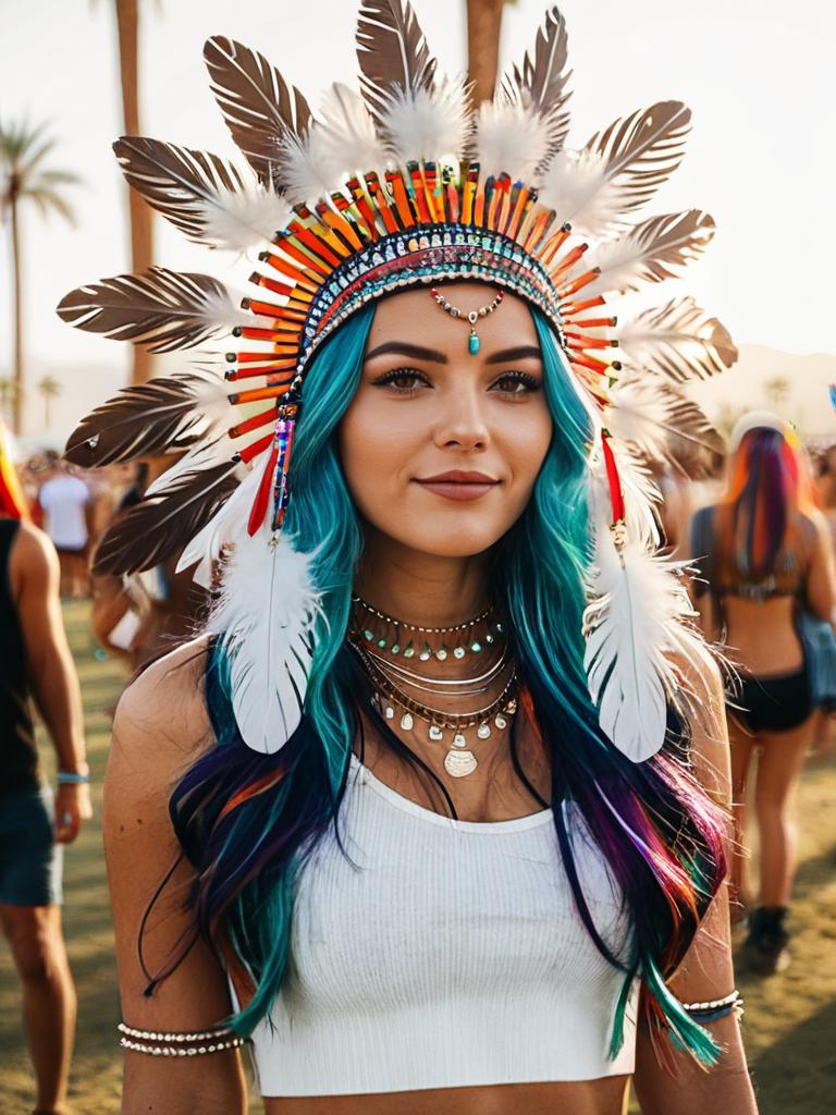 Coachella Rave, woman with colorful hair and a feather headdress --sref 1400
