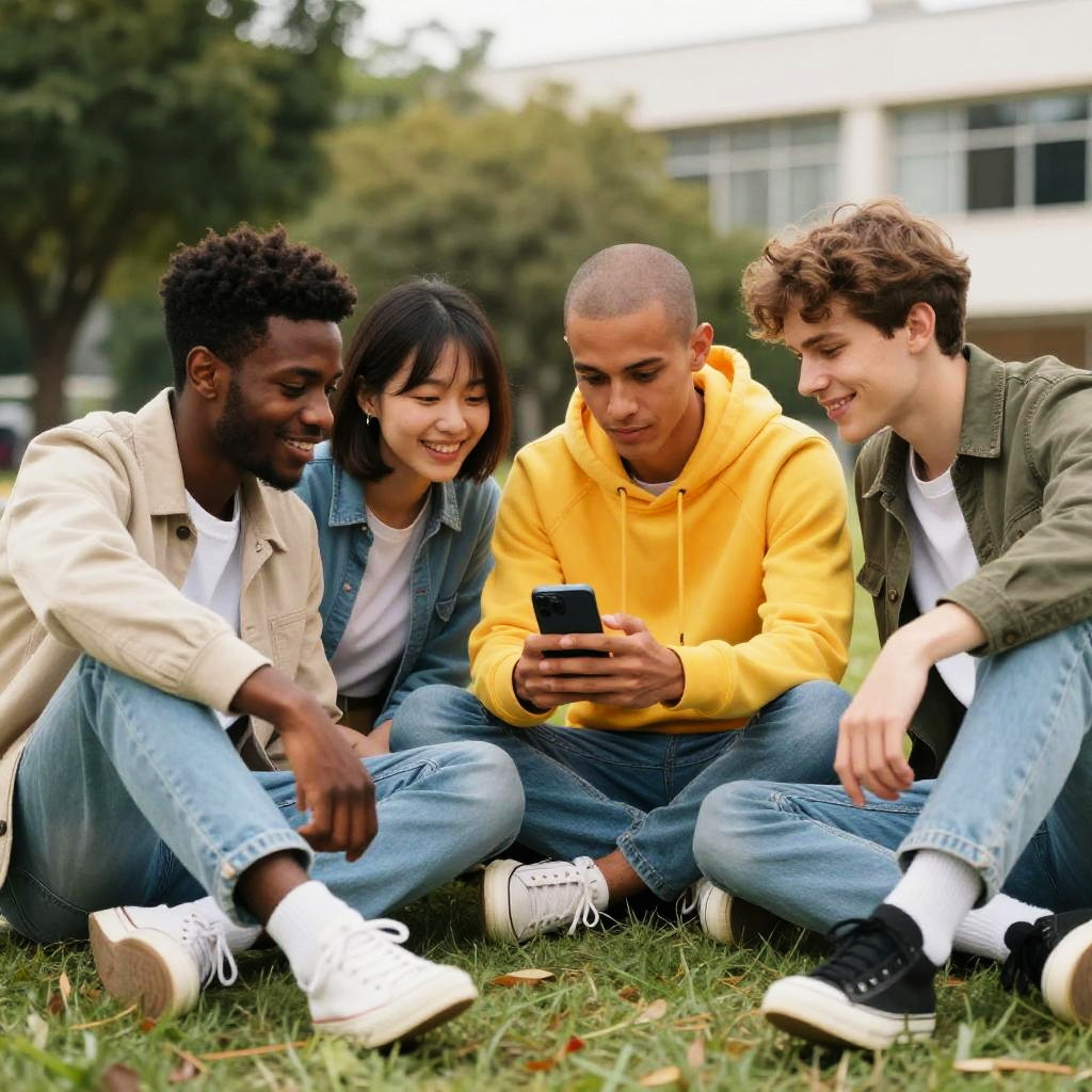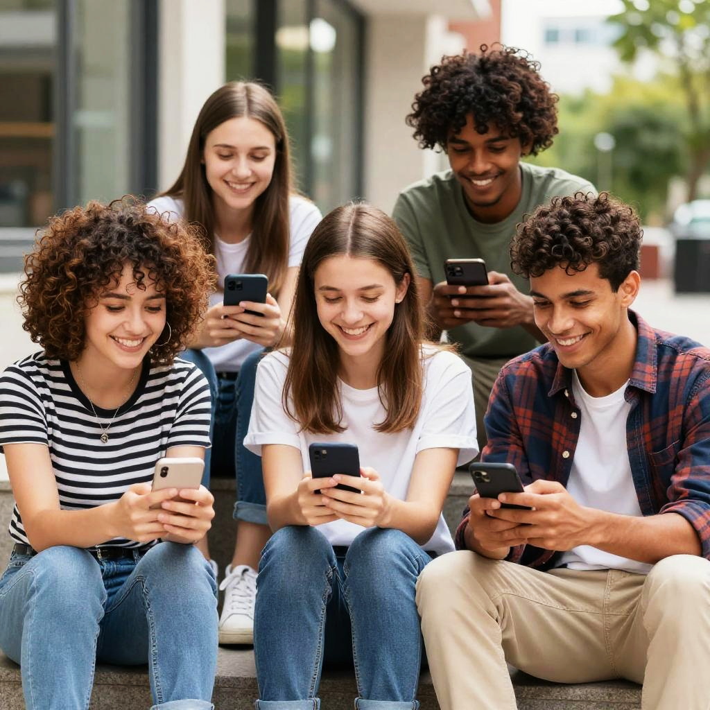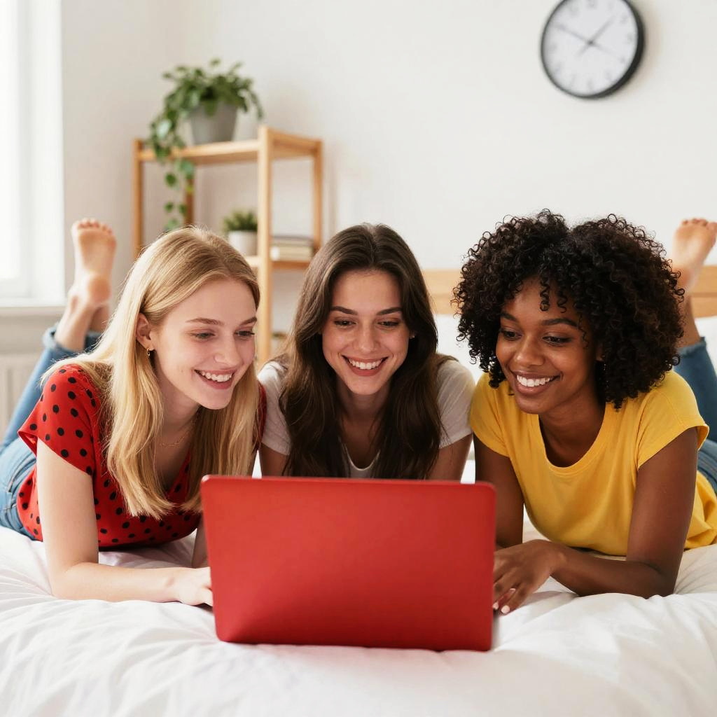 Photograph of three smiling women standing close together in an urban setting, looking at a smartphone held by the woman on the left. She has long dark hair, a white crop top, and high-waisted jeans. The woman in the middle has blonde hair, a white strapless top, and denim shorts. The woman on the right has curly black hair, a yellow sleeveless top, and blue jeans, holding a red shopping bag. Modern buildings are in the blurred background.