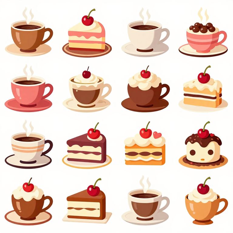Digital illustration of four icons: steaming coffee cup on saucer, framed steaming cup, slice of cheesecake with brown topping, layered cake with
