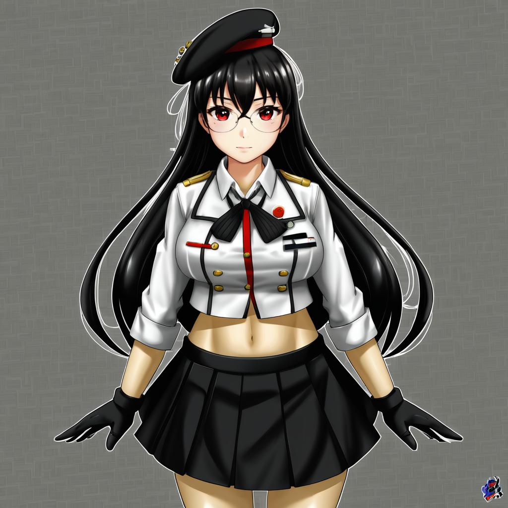 Choukai kai ni (kancolle), kantai collection, 1girl, red eyes, glasses, rimless eyewear, long hair, black hair, hair ornament, large breasts, cleavage, navel, black gloves, pleated skirt, mini hat, beret, headgear, midriff, by artist mappaninatta, anime