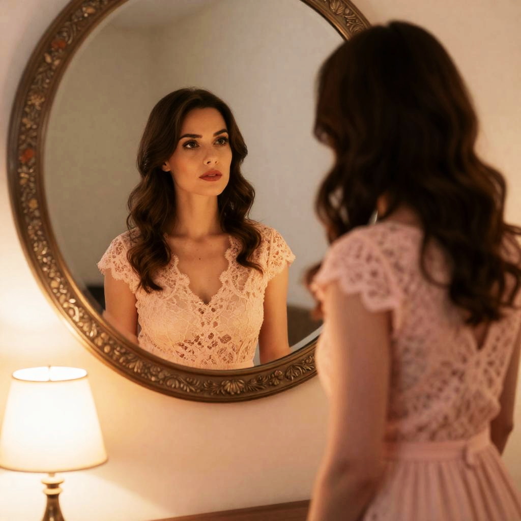 Woman with curly brown hair in peach sleeveless top applies makeup in front of ornate mirror. Reflected woman in white floral robe stands with neutral expression. Lamp with warm light on left, floral wallpaper background. Mirror, makeup items, bottle on dresser.
