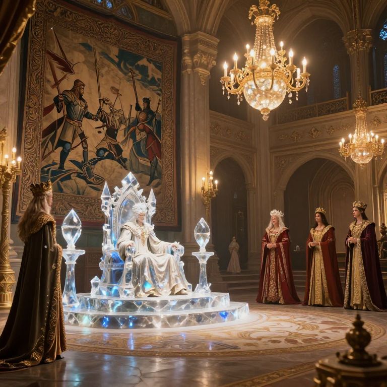 Photograph of an opulent, grand hall adorned with elaborate chandeliers and ornate arches. Five regal figures in rich, maroon and gold robes with ornate headpieces stand around a large, illuminated ice sculpture of a medieval king on a throne, surrounded by crystal-like structures. The background features a large, detailed mural depicting warriors in action. The hall's marble floor and intricate wall patterns add to the luxurious setting. The lighting from the chandeliers casts a warm, golden glow, contrasting with the cool, blue lights of the ice sculpture.