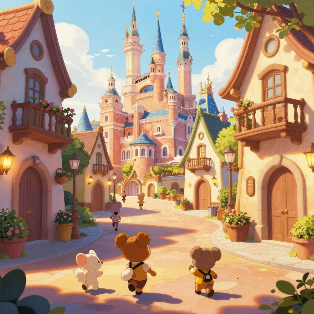 How to make a Disney poster featuring a magical castle in vibrant colors, enchanted forest background, whimsical fairy tale elements, sparkling fireworks, and playful animated characters, designed in a classic vintage Disney style with bold typography and dreamy atmosphere.