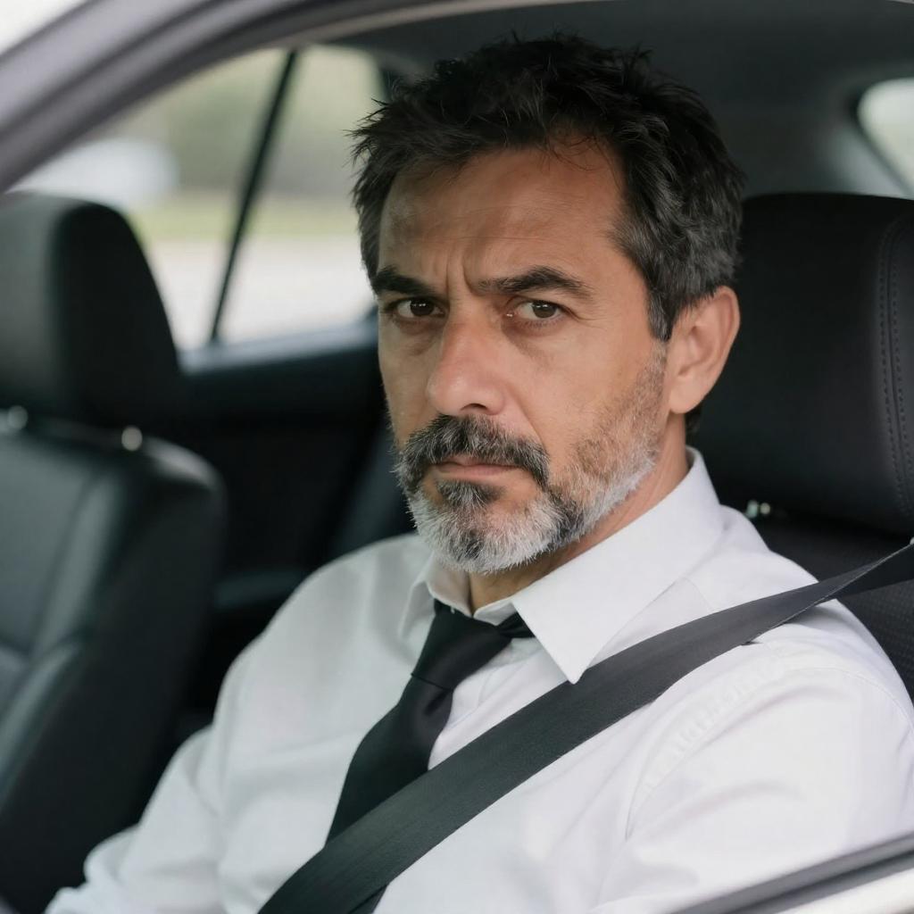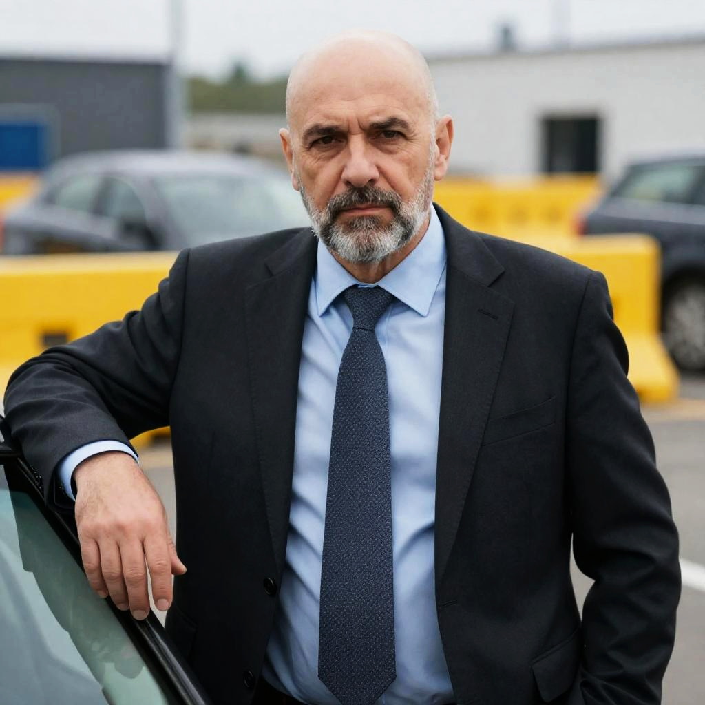 Middle-aged man with dark beard and intense expression, wearing black beanie, gray jacket over blue shirt, standing outdoors. Background includes blurred trees, red motorcycle, and partial car. Natural light. Lower body not visible.