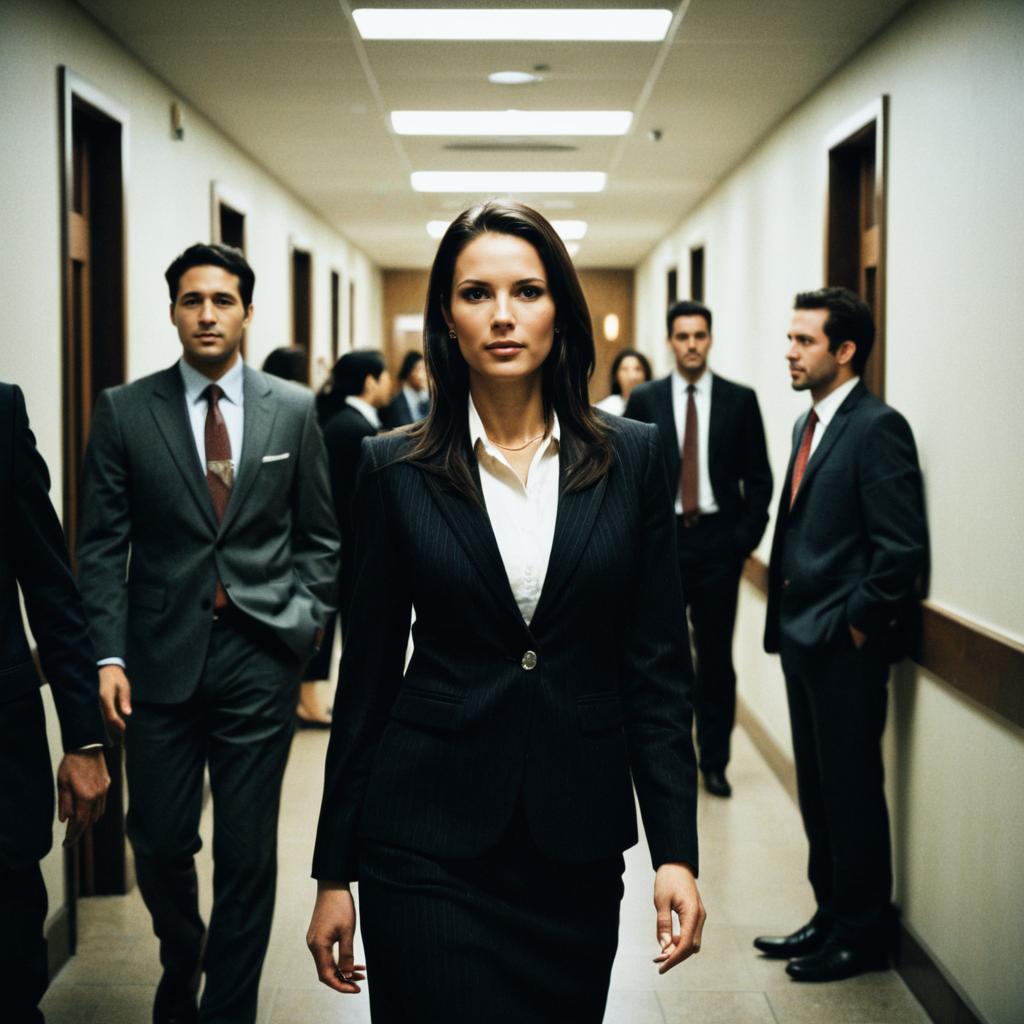 Business Attire Party, woman in business suit standing in a hallway with other people