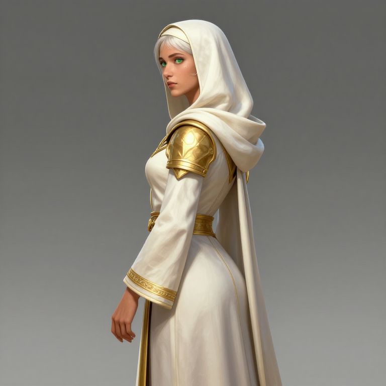 CGI image of a stern, fair-skinned woman in an elegant white robe with gold armor details, white hood, and blue eyes, standing against