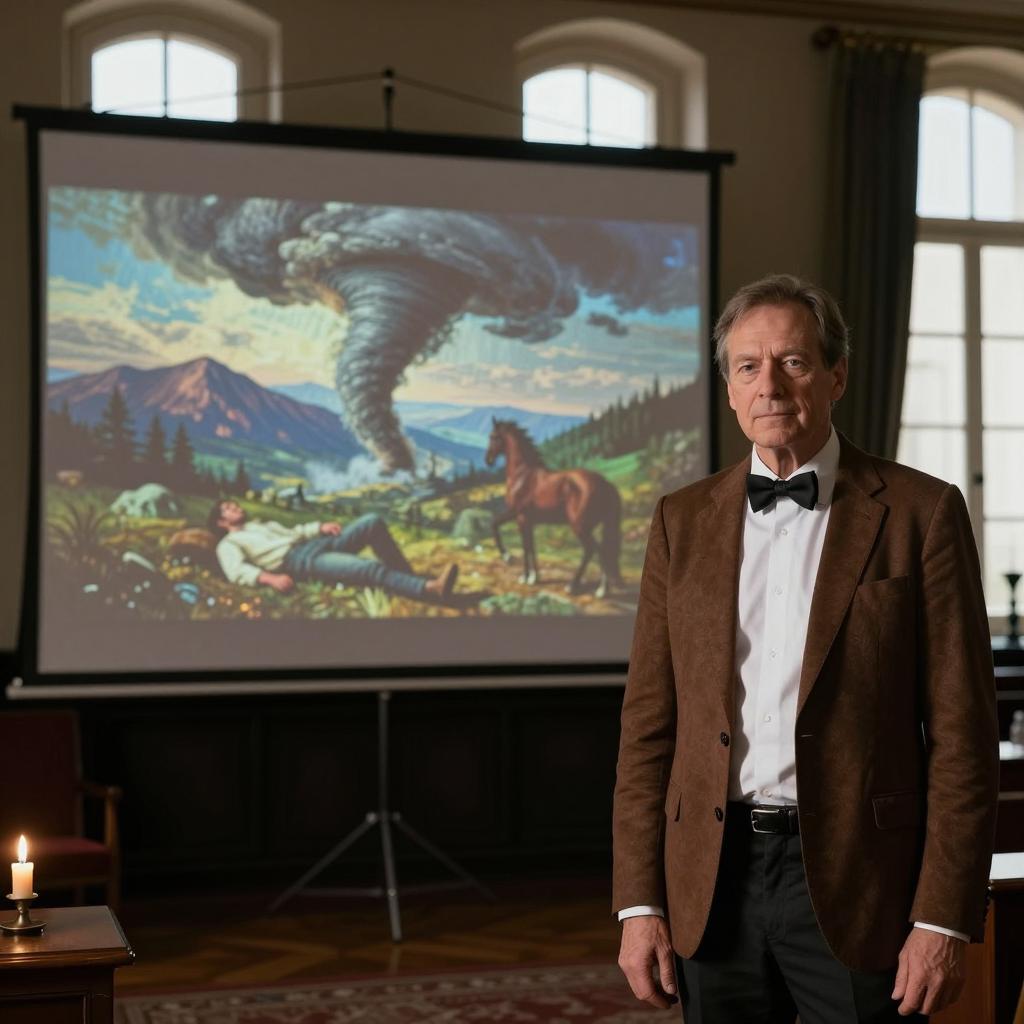 A middle-aged man with fair skin and short hair wearing a brown blazer, white shirt, and black bow tie stands to the right of a large projection screen showing a painting. The painting depicts a dramatic mountain landscape with a tornado, a man lying on the ground, and a horse. The room features tall windows, dim lighting, wooden furniture, red upholstered chairs, and a burning candle on a small table.