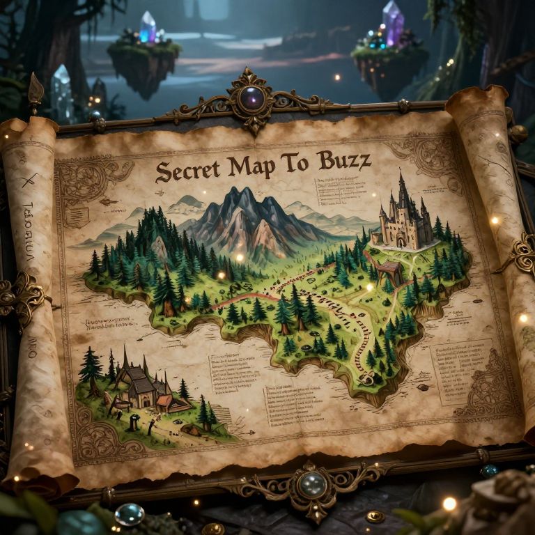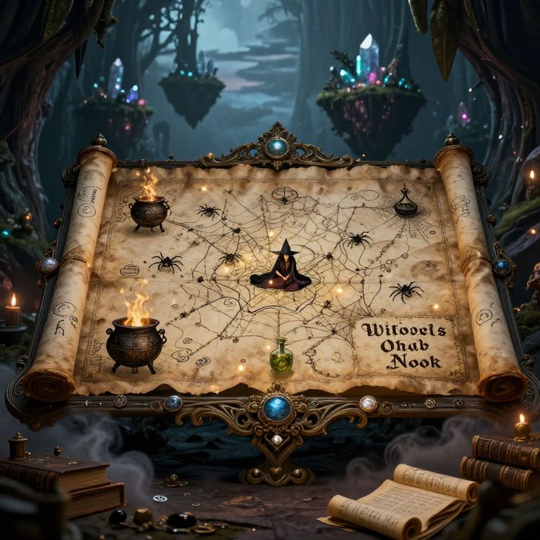 In a twilight realm of floating isles and crystal forests, a closeup of an ancient map, with tiny dots of light floating around it on an ancient ornate altar, ancient runes made of jewellery and stone, the map is very ornately decorated with a witches cauldron, potion bottles and cobwebs, surrounded by fantasy magical dark caves and mystical smoke on the floor, a library of ancient books and scrolls, with the words \"Witches Nook\" in dark cursive text, A witch sitting next to a smoking cauldron, in the middle of the map, surrounded by tiny dots of light, The map is detailed with etchings of spiders, the map is old and worn from time