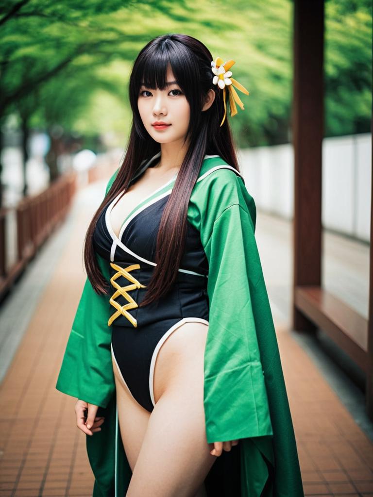Photo-realistic cosplay photo of person standing in hanazono tae costume. 1girl, green eyes, hair between eyes, long hair, black hair, brown hair, sidelocks, medium breastsfull body shot. lifestyle stock photo, shallow depth of field, lifestyle stock photography, shallow depth of field, natural lighting, warm tones, soft background blur, vibrant colors, realistic textures