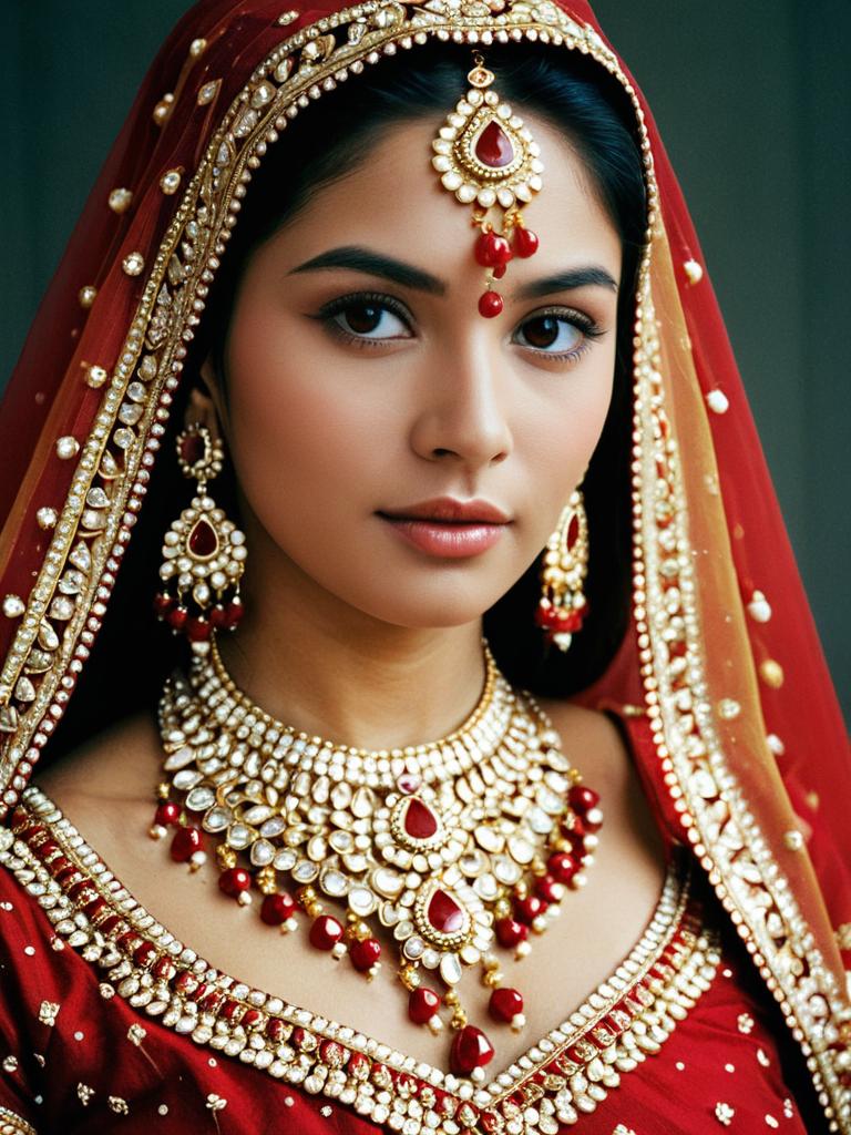 Indian Bridal Costume Jewelry Sets, a woman in a red and gold outfit with a red veil