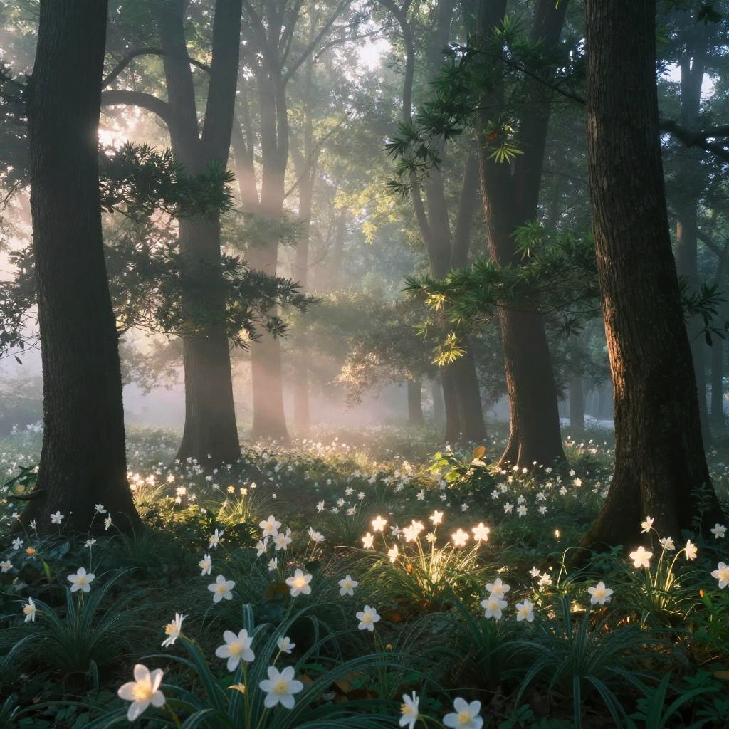 Hua, an ethereal mystical forest at dawn, glowing flowers and soft mist, delicate light filtering through ancient towering trees, magical and serene atmosphere, vivid colors blending with shadows, fantasy landscape with a peaceful aura
