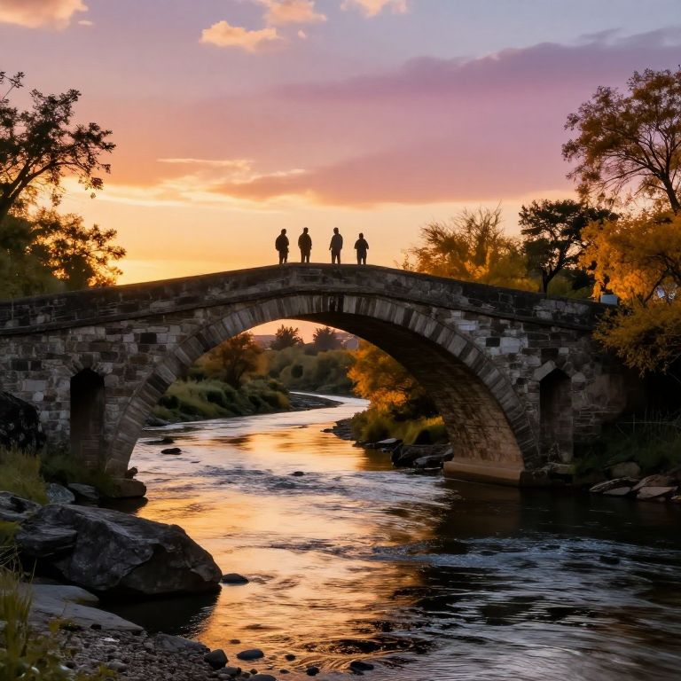 Sunset bathes a serene stone arch bridge spanning a tranquil river, with four silhouetted figures standing atop its curve, framed by golden foliage and rocky shores under a vibrant sky.