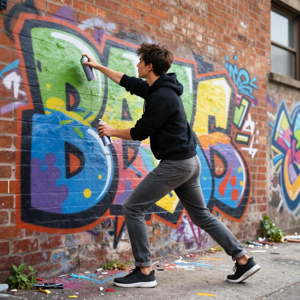 Mimo, a stylish young artist painting vibrant graffiti on an urban brick wall, dynamic pose with spray cans, expressive brush strokes, colorful street art background, energetic and raw atmosphere, emphasis on contrast and vivid colors.