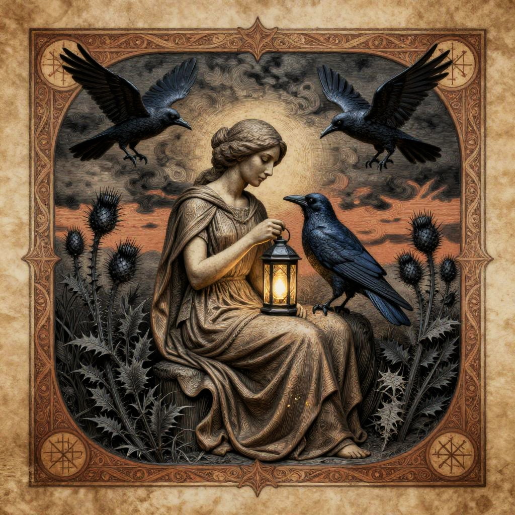 Intricate neo-gothic engraving featuring a seated lady in flowing robes holding a lantern, surrounded by black thistles and perched midnight blue raven. The background showcases a stormy charcoal dusk sky with swirling crows. The artwork employs meticulous crosshatching, soft chiaroscuro, and a burnt umber and persimmon color palette on aged parchment with ornate tarot-style border and arcane sigils. The composition has ultra detailed linework and a mystical aura with subtle gold ink flecks.