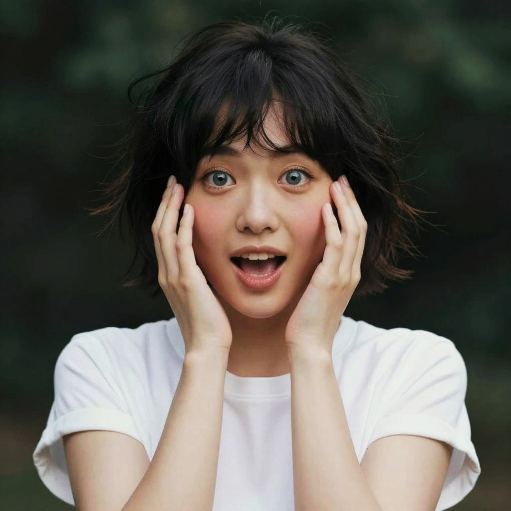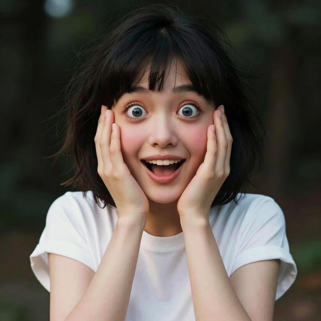 Cinematic photo crazy insane, high energy, magic, hyper realistic, detailed and realistic portrait of a woman, cartoon style, round eyes and short messy hair shot outside, wearing a white t shirt, skin texture, chapped lips, soft natural lighting, portrait photography, 85mm lens, magical photography, dramatic lighting, photo realism, ultra-detailed, intimate portrait composition, Cinestill 800T, front light, (open mouth), smiling, atletic small waist, (((masterpiece))), ((best quality)), (((8k photography)), ((hands on face)), (elegant, beauty), ((blushed)), ((beautiful light gray eyes)), ((sexy goth girl, pure delicate innocent face)) and (smooth detailed face), (((hyper realistic))), ((black hair))), (blunt bangs), (symmetrical legs), symmetrical perfect body, sharp focus, (volumetric lighting), intricate details, rainbow paint, a girl made entirely out of rainbow paint, entirely paint, 1girl, (intricate details, hyperdetailed:1.15), gorgeous lighting, rainbow, paint splatter, splashes, very rainbow, very colorful, neon, paint drops, rainbow paint background, colorful background, ((high detailed skin, 8k uhd, dslr, soft lighting, high quality, film grain, Fujifilm XT3, HD, Sharp)), (canon 50mm) intricate details photorealistic . 35mm photograph, bokeh, professional, 4k, highly detailed, A glitched-out (anime girl:1.3) dances across the screen, her movements and form constantly shifting and (deconstructing:1.2), embodying the dynamic essence of (breakcore:1.2), dynamic essence:1.1, cute red cheeks