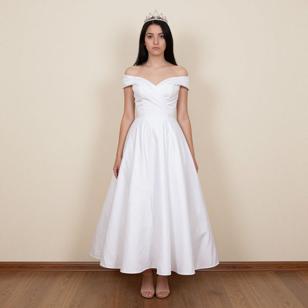 Photograph of a young woman with pale skin and long, straight black hair, standing against a plain beige wall. She wears an off-the-shoulder, white satin wedding dress with a sweetheart neckline and a full, knee-length skirt. She has a simple, silver tiara on her head and is wearing nude-colored, open-toe heels. The wooden floor contrasts with her white dress, and her expression is neutral. The lighting is even, highlighting the sheen of the satin fabric.