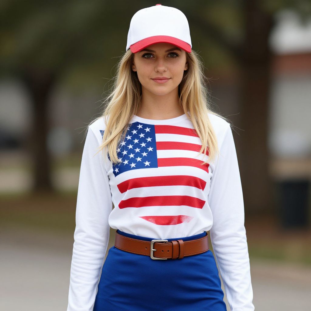 Photograph of a young Caucasian woman with long blonde hair, wearing a white baseball cap with a red brim, a white long-sleeve shirt with an American flag design on the chest, blue high-waisted pants, and a brown belt. She stands outdoors in a blurred park-like background with trees and greenery. Her expression is neutral, and she looks directly at the camera. The colors are vibrant, with the red, white, and blue of the flag design and cap standing out against her white shirt and blue pants.