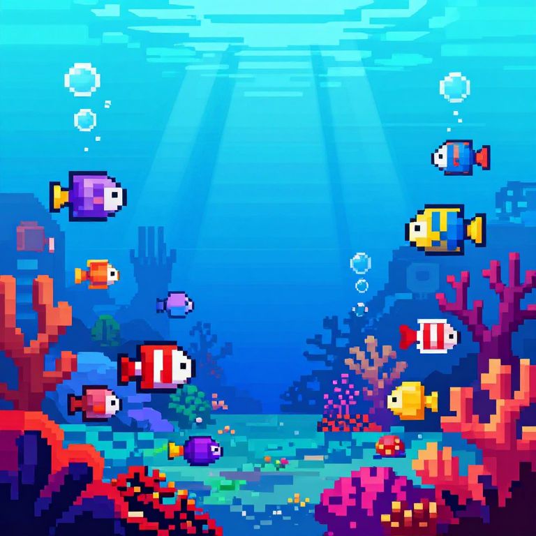 Pixel art underwater scene with colorful fish, coral, and bubbles in bright blue water. Vibrant fish in red, yellow, white, and purple swim