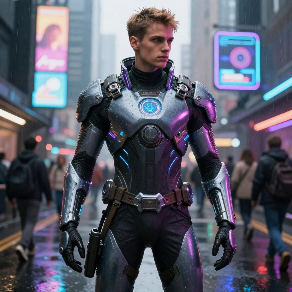 Photorealistic CGI image of a young, white male with short, brown hair, standing confidently in a neon-lit, rainy city street. He wears a sleek, black, cybernetic suit with glowing blue and pink accents, equipped with a circular blue light on his chest and robotic arms. The suit is detailed with metallic textures and futuristic design. Background features blurred, colorful neon signs and people walking, with wet pavement reflecting the lights. The scene evokes a cyberpunk aesthetic, with a focus on advanced technology and futuristic urban life.